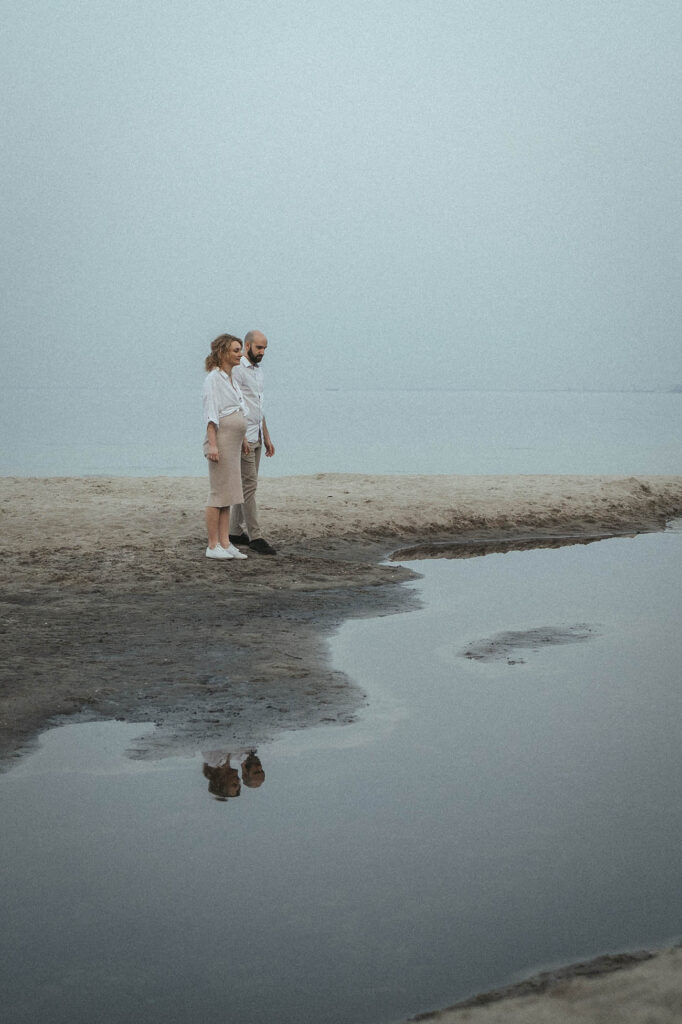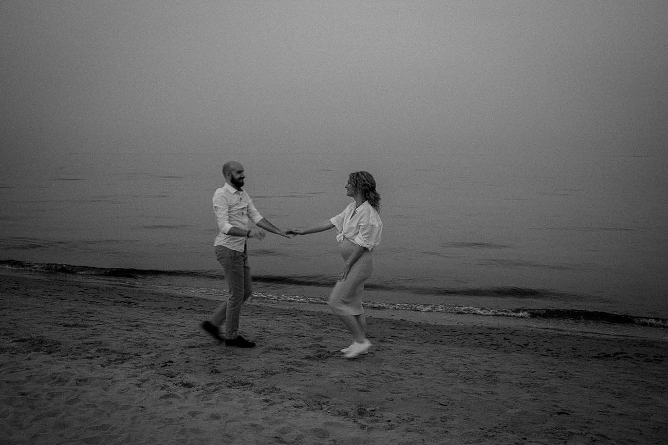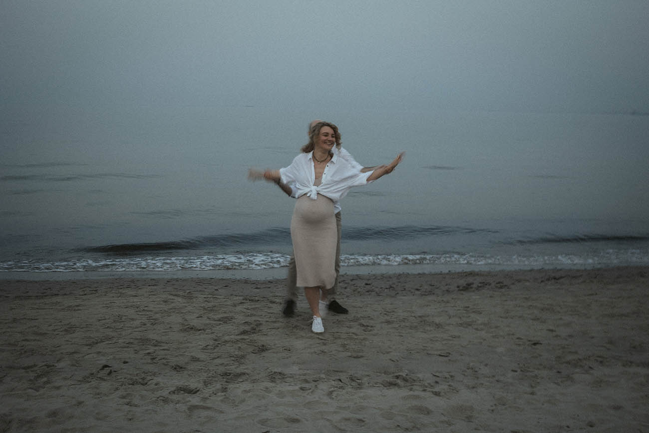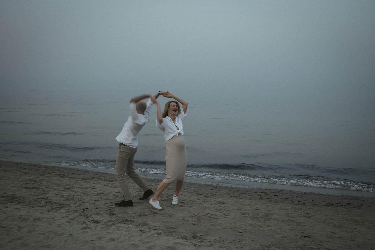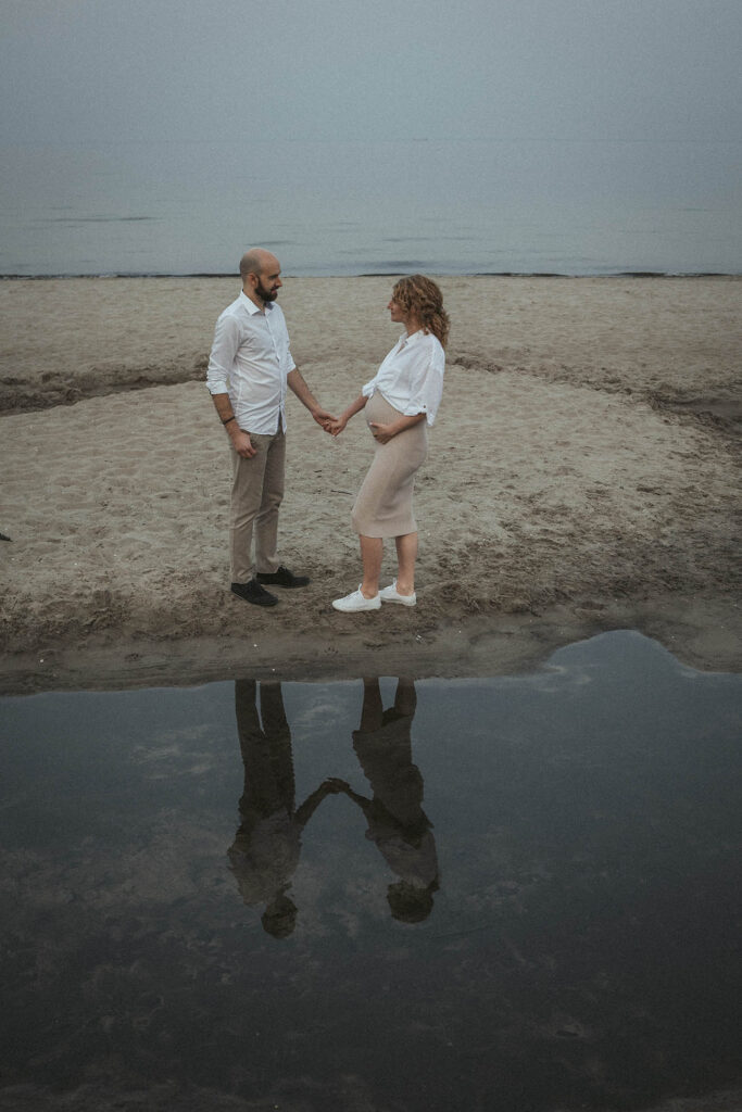 Sesja zdjęciowa rozpoczęła się od klasycznych brzuszkowych ujęć, a następnie przeszliśmy się na plażę. Wszystkim spodobał się pomysł wykorzystania odbicia w tafli wody, które sprawiło, że ciążowe ujęcia wydają się jeszcze ciekawsze. Nie trafiliśmy na romantyczny zachód słońca, ale to nie przeszkodziło parze w okazywaniu uczuć i dobrej zabawie. Luźna atmosfera sprawiła, że postanowili nawet zatańczyć nad brzegiem morza!