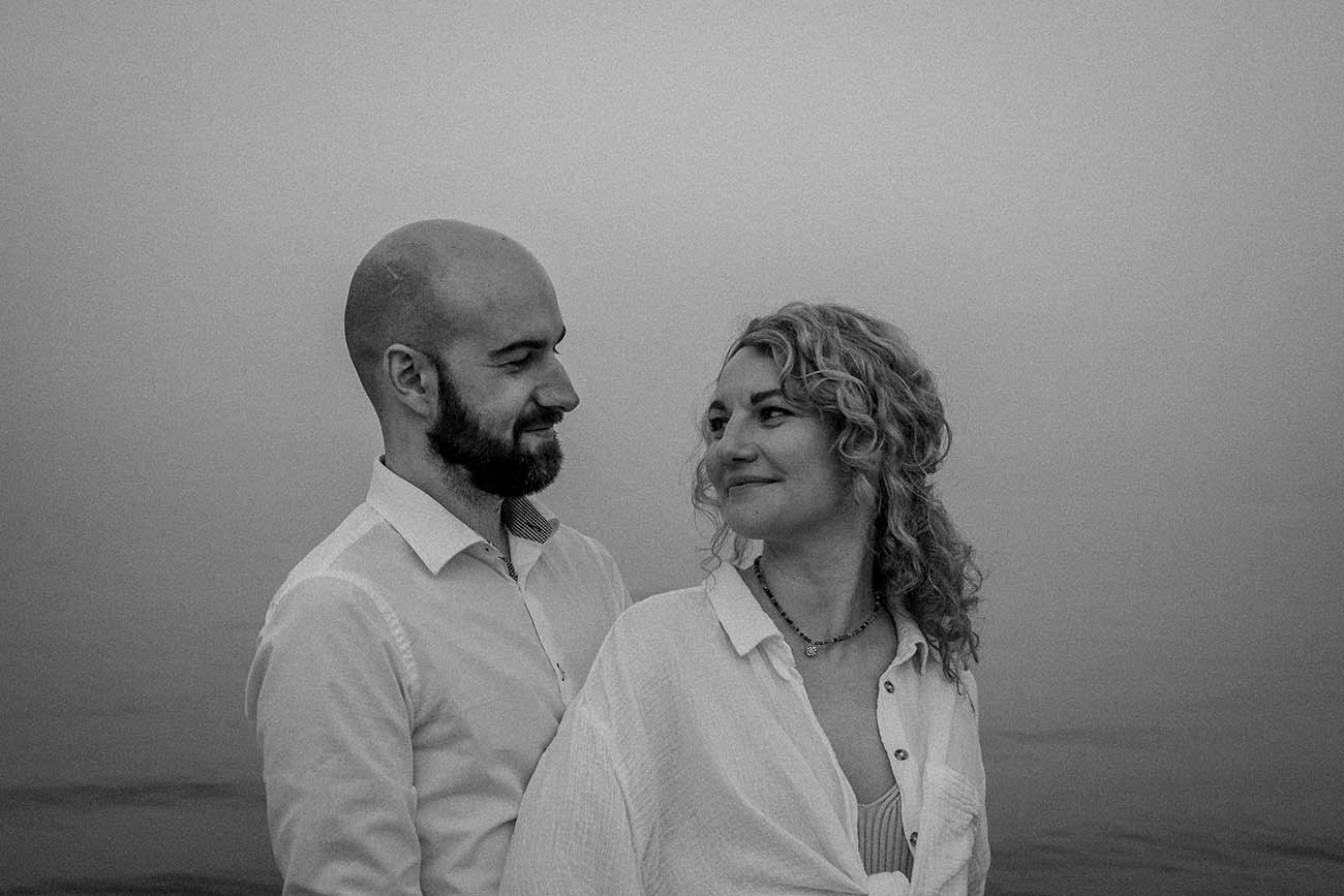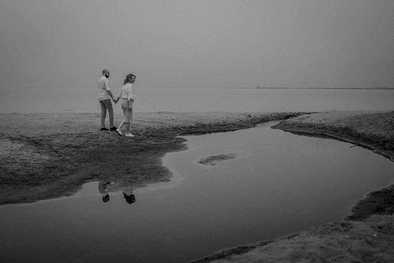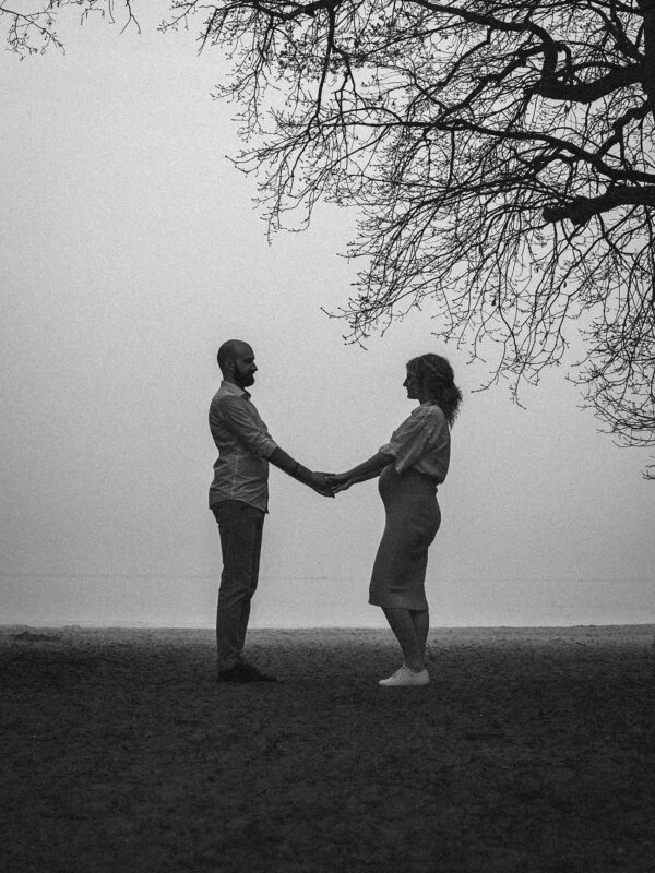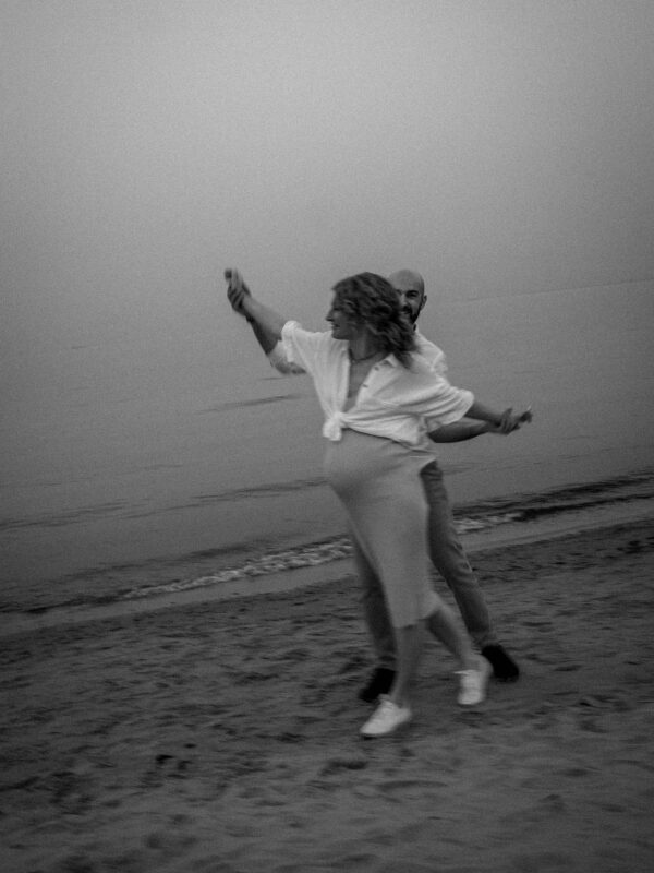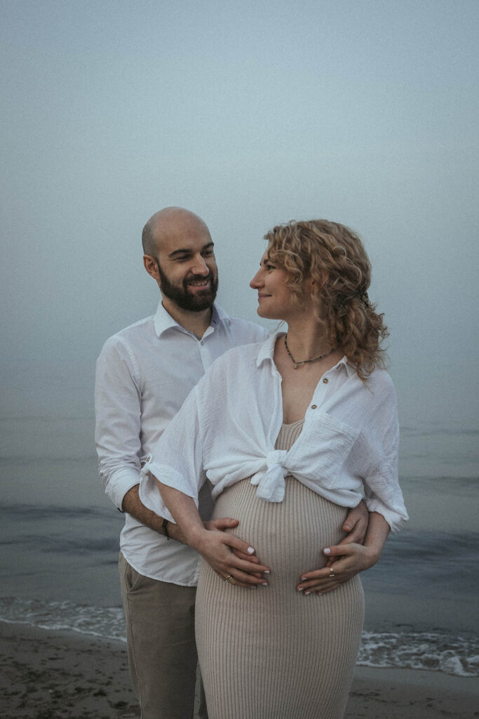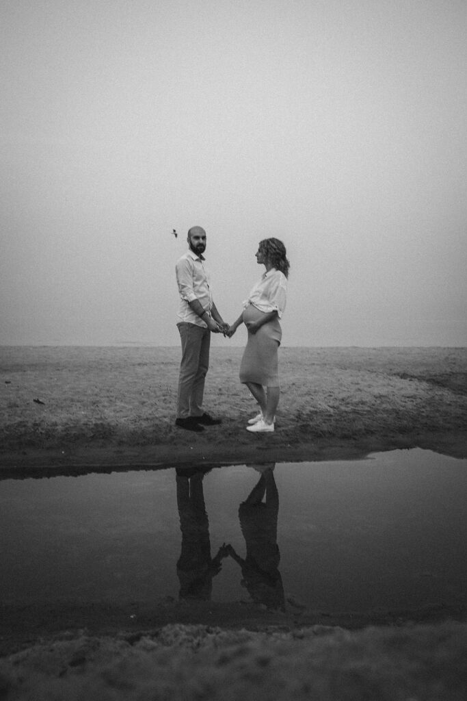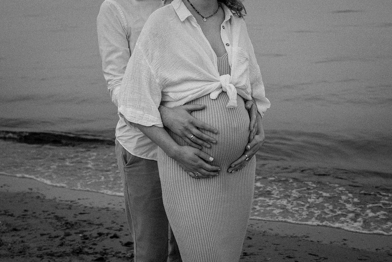 Sesja zdjęciowa rozpoczęła się od klasycznych brzuszkowych ujęć, a następnie przeszliśmy się na plażę. Wszystkim spodobał się pomysł wykorzystania odbicia w tafli wody, które sprawiło, że ciążowe ujęcia wydają się jeszcze ciekawsze. Nie trafiliśmy na romantyczny zachód słońca, ale to nie przeszkodziło parze w okazywaniu uczuć i dobrej zabawie. Luźna atmosfera sprawiła, że postanowili nawet zatańczyć nad brzegiem morza!